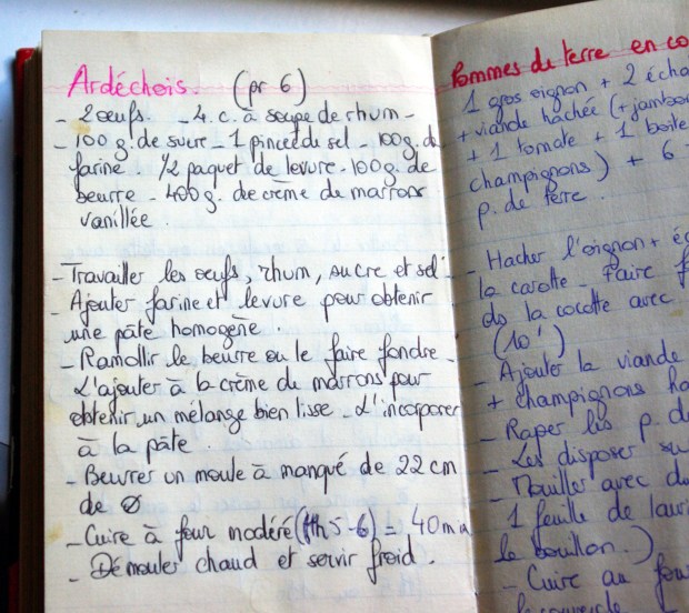 Vous pouvez faire des gâteaux avec. Il y en a un qui s’appelle l’Ardèchois, parce qu’on trouve beaucoup de châtaigniers dans le département de l’Ardèche. Très facile à faire ! Et il plaît même à ceux qui n’aiment pas la crème de marrons. Voici la recette familiale. (Mais personnellement, je préfère le faire cuire dans un moule à cake – rectangulaire – plutôt que dans un moule rond.)