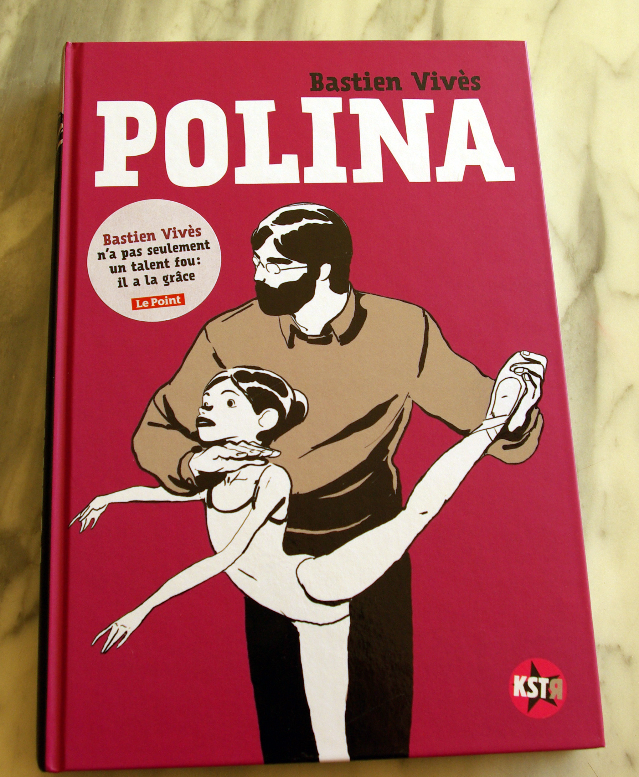Polina, c’est l’histoire d’une… d’une petite fille qu’on va suivre de ses six jusqu’à ses trente ans. C’est un livre sur l’apprentissage et la relation maître-élève. Donc c’est une petite danseuse et… et on va suivre la relation qu’elle va avoir avec… avec son professeur de danse, Monsieur Bojinski, et comment est-ce que cette relation va… va nourrir sa carrière et ses ambitions artistiques. Et j’ai pris Polina, je lui ai mis ce… ce petit nez assez noir parce que… des… d’une (1), je me suis inspiré physiquement d’une copine à moi. Elle a un nez comme ça, un peu… Mais il est assez rouge. Et donc, vu que (2) j’étais en noir et blanc, au début, je l’ai dessiné noir. Et… et puis, au fur et à mesure (3), j’ai gardé ça. Ça aurait pu être un autre code graphique mais pour le coup, je l’ai gardé. Mon père, illustrateur, peintre, tout ça, m’engueulait (4) parce qu’il me disait: « Mais c’est pas possible. Vire-lui (5), ça lui fait un nez… un nez de chien ou de je sais pas quoi », et au fur et à mesure… Au début, elle avait le nez tout… tout noir et donc après, j’ai juste gardé le sommet du nez. Et puis, ça… ça a fonctionné. Je voulais parler de… de… de l’apprentissage, donc au niveau des notions… Le rapport qu’on peut avoir avec l’art et avec… avec la difficulté qu’est le métier de danseuse. Que là, j’ai pris la danse classique parce que c’est tellement cruel et difficile – peut-être un des plus difficiles – que ça pouvait bien illustrer le propos (6), quoi. Il y a… Il y a quand même un truc qui était important, c’est que le professeur Bojinski ait la relation qu’elle a… qu’il a avec Polina, elle est pas juste sur le plan artistique et… et ou même intellectuel. Il y a vraiment une notion de… de… de tendresse. Et je pense que c’est des… que la tendresse, c’est quelque chose qui… qui est propre à… La tendresse, le respect, l’admiration, c’est propre à des… des relations comme ça très fortes, maître-élève.