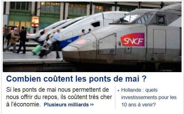Fin d’un long weekend pour beaucoup de Français. C’est que cette année, par le hasard des dates, deux jours fériés se suivaient dans la même semaine: le 8 mai et l’Ascension. Et comme c’était un mercredi et un jeudi, c’était l’occasion de faire ce que nous appelons Faire le pont, c’est-à-dire prendre aussi le vendredi pour enchaîner avec le weekend. Cette année, c’est bien tombé !