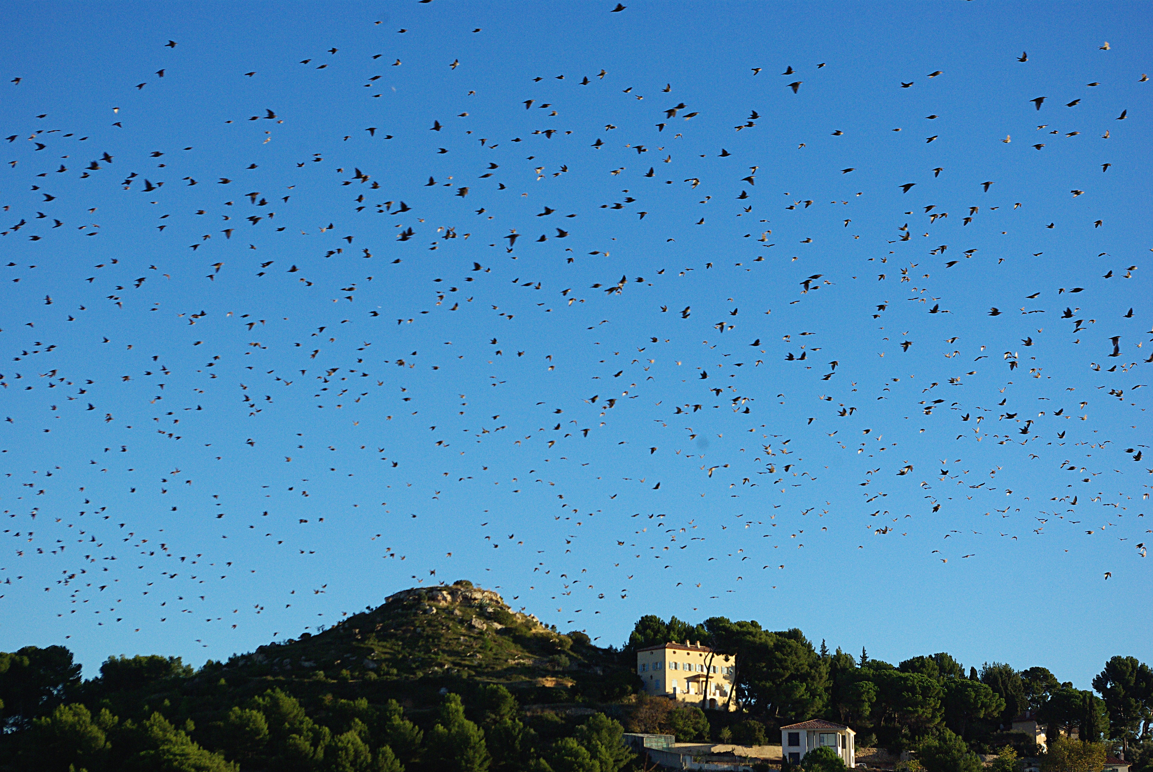 Ces nuées d’étourneaux bruyants qui se suivent, se pourchassent, s’entrecroisent par centaines dans le ciel d’automne, il y a vraiment de quoi faire perdre leur sang-froid même aux chats les plus sereins !