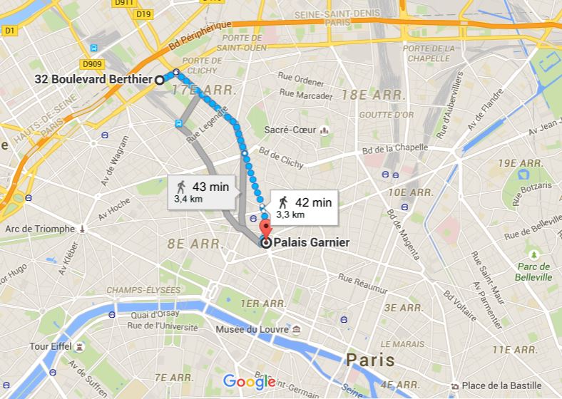 Une carte d’aujourd’hui pour illustrer le trajet que faisaient autrefois ceux qui travaillaient à la fabrication des décors de l’Opéra de Paris. Ces toiles immenses étaient peintes aux ateliers Berthier, puis roulées avec précaution et transportées à pied par les grands boulevards parisiens.