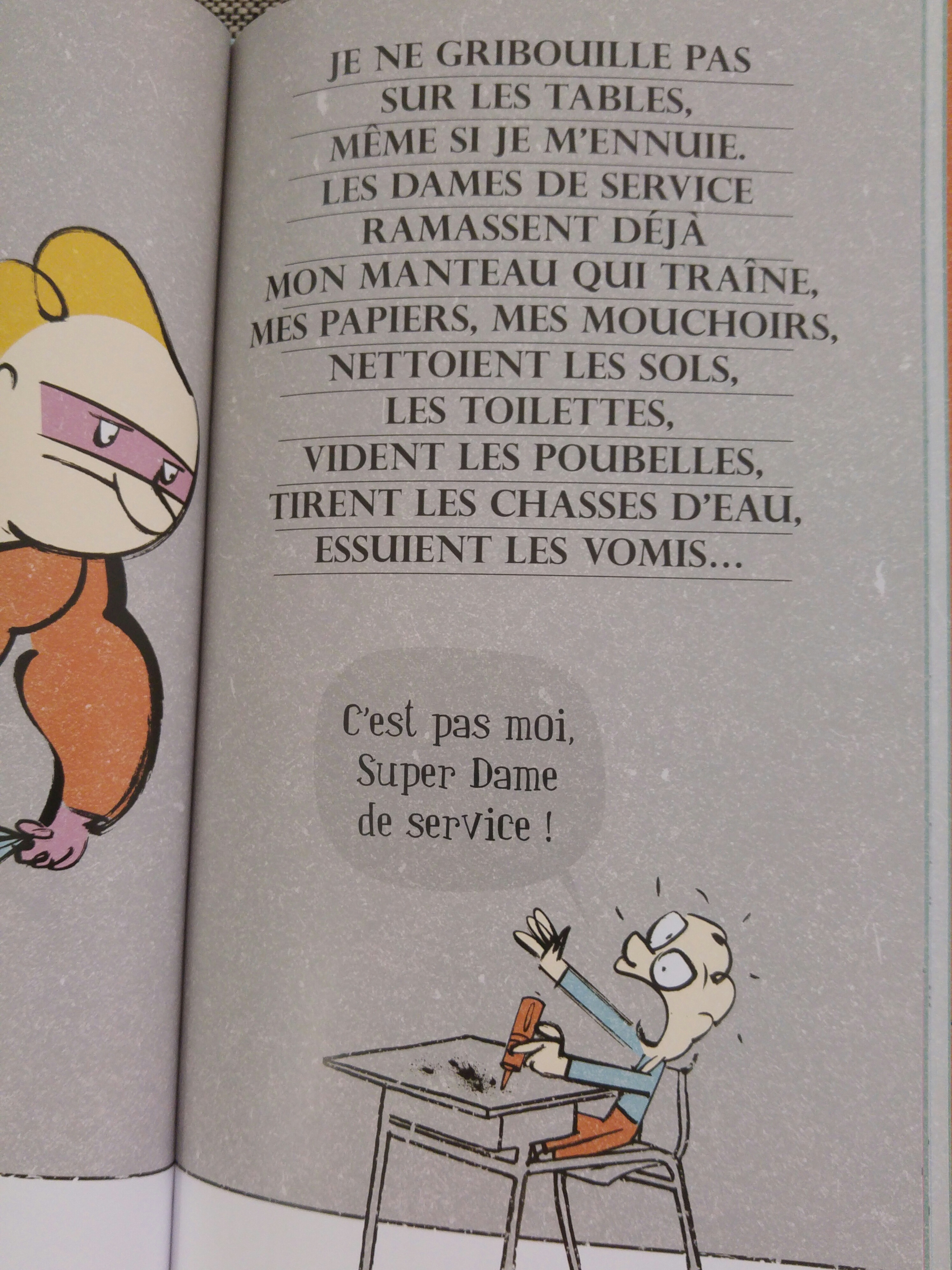 A la rentrée, on prend de bonnes habitudes, en classe notamment. Et cela concerne les petits et les grands ! J’ai trouvé cet album qui s’adresse aux petits écoliers. Mais je me demande si cela ne ferait pas du bien à certains de mes grands étudiants de méditer quelques unes des recommandations qu’on y lit !