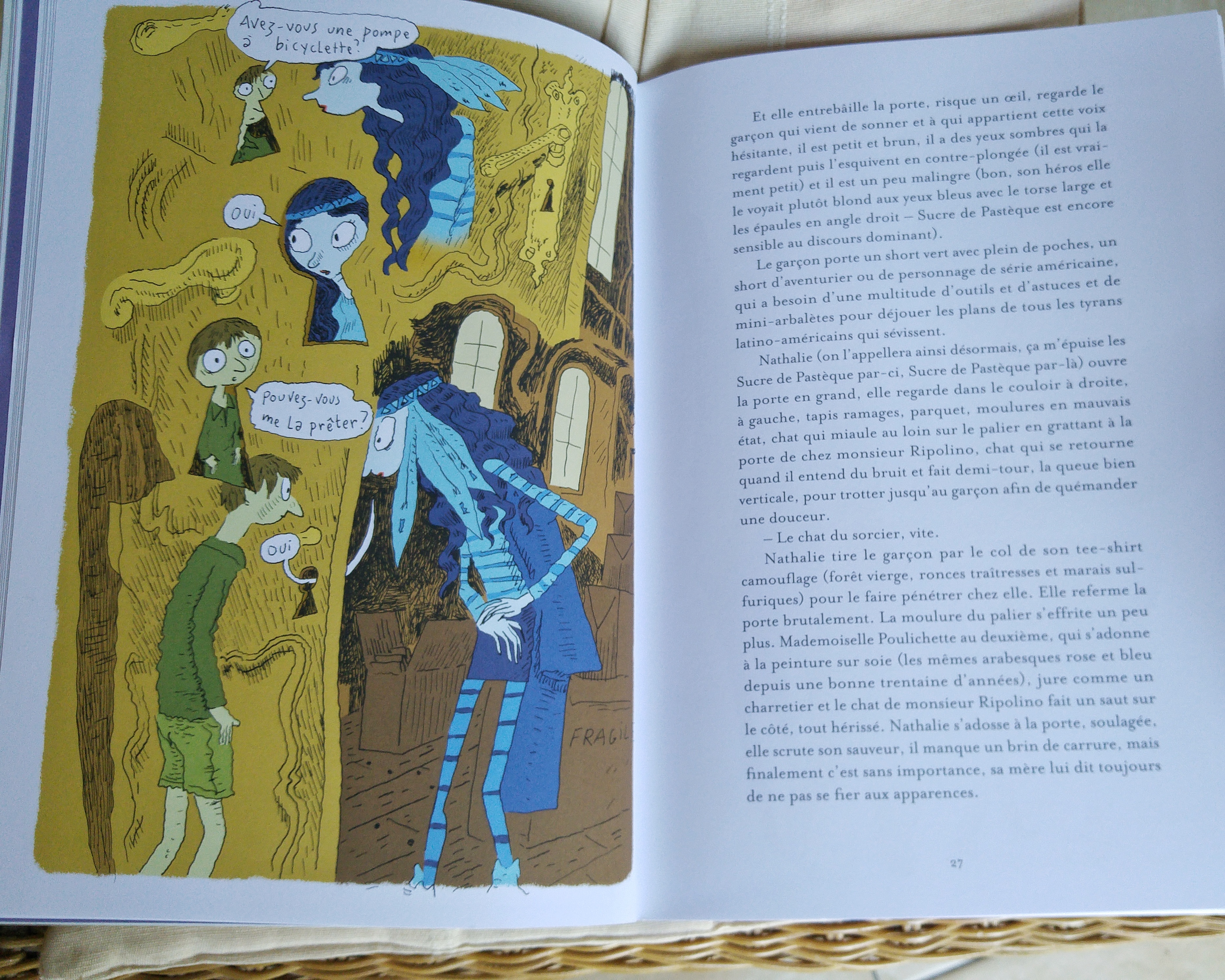 Mon coup de coeur de ces dernières semaines ! Et je vais garder ce livre précieusement, pour ne plus quitter Nathalie et Eugène, les deux enfants / adolescents imaginés par Véronique Ovaldé et dessinés par Joann Sfar. Ce n’est pas une BD, mais une histoire qui naît des mots vivants, poétiques et drôles de l’écrivaine et des illustrations imaginées à partir du texte par le dessinateur. Vous savez, pour les moins jeunes d’entre nous, comme ces livres qu’on lisait enfant, où il y avait au détour des pages couvertes de mots quelques dessins qui tout à coup donnaient vie à ces histoires. (Mais là, il y a beaucoup plus de dessins, dans lesquels on peut se plonger pour regarder une multitude de détails.)