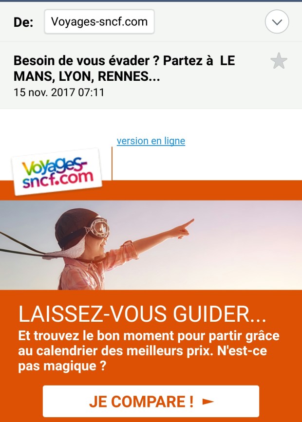 J’ai reçu ce message de Voyages-Sncf – devenu depuis peu Oui.Sncf – pour me rappeler que ce serait bien de m’évader, en train bien sûr, avec des suggestions. Direction Le Mans, Lyon, Rennes…