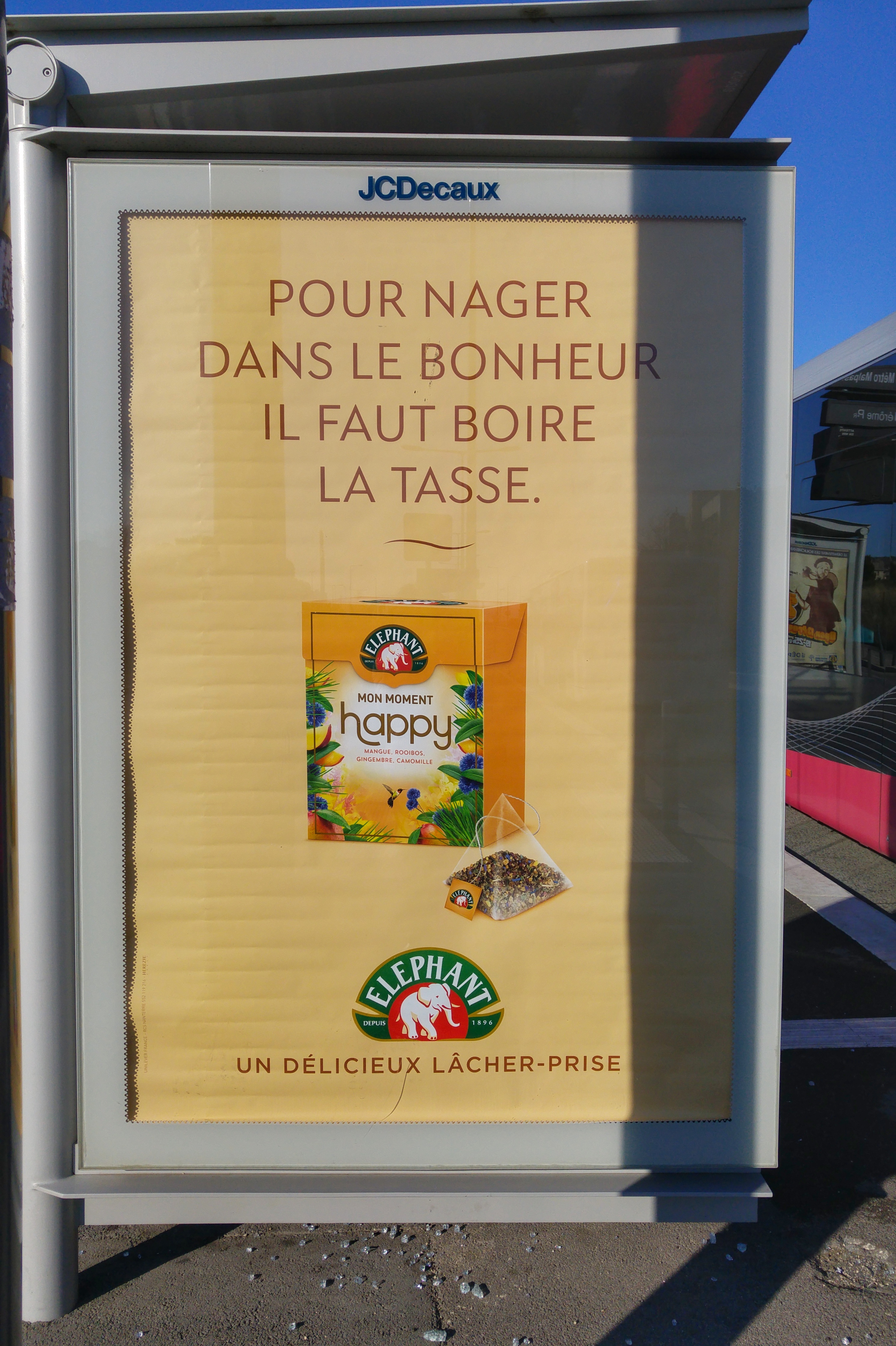 Et là, tout cela comment ? En buvant une tasse de cette infusion quand le besoin se fait sentir. Ce qui attire l’attention sur cette boisson somme toute banale et un peu vieillotte, c’est que le slogan repose sur l’expression boire la tasse. Or, boire la tasse, c’est avaler de l’eau en nageant (dans l’eau, pas dans le bonheur), et ça, ce n’est pas très agréable parce qu’on a l’impression qu’on va se noyer. C’est aussi, au sens figuré, connaître un échec. Donc un slogan qu’on retient à cause de ce téléscopage des mots et de ces expressions revisitées. Ou comment boire la tasse devient la clé du bonheur.