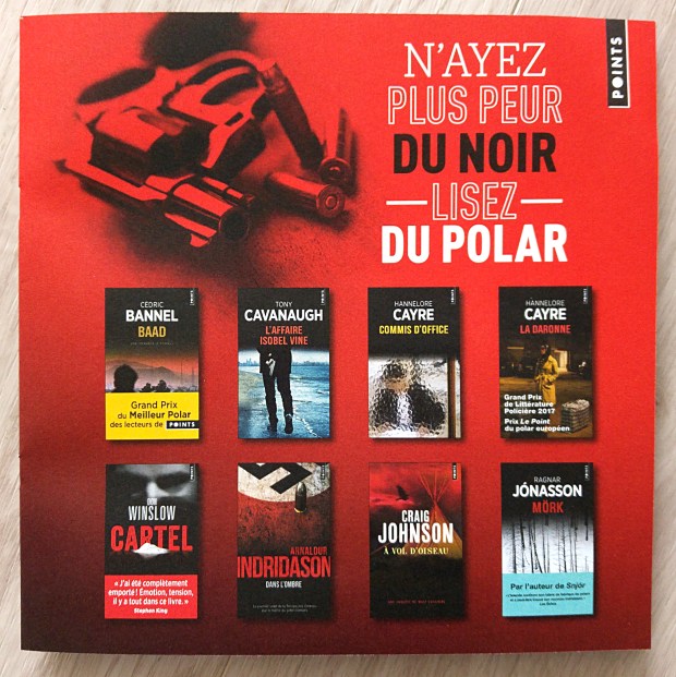 J’ai trouvé que cette publicité pour nous encourager à lire des romans policiers était bien trouvée, avec sa rime et son jeu de mots sur noir, même si pour les spécialistes, entre littérature policière – les polars – et romans noirs, il y a des différences. (Voici ce qu’en disait Jean-Patrick Manchette, un des maîtres français du roman noir : « Le bon roman noir est un roman social, un roman de critique sociale, qui prend pour anecdote des histoires de crimes, mais qui essaie de donner un portrait de la société.« )