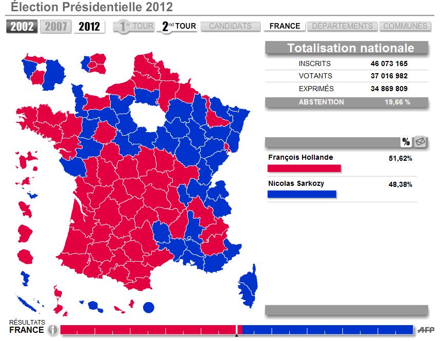 Voici notre estimation du résultat de la Présidentielle en ce 6 mai 2012: c’est François Hollande qui est élu Président de la République.